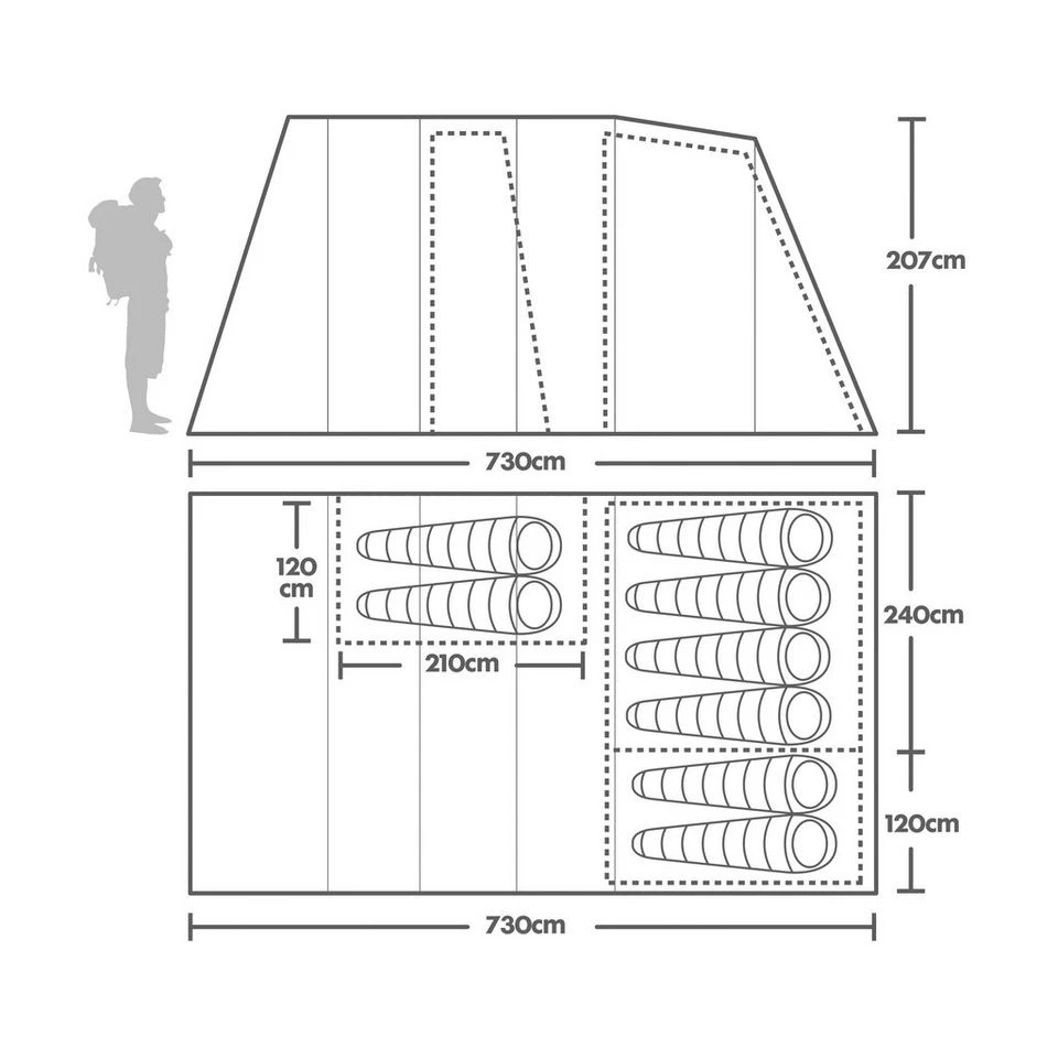 The sewn-in groundsheet keeps your tent floor free of draughts, bugs and moisture. The tunnel shape also gives plenty of head room for easy navigation through the tent and ensures that air is able to flow through the tent to avoid it becoming hot and stuffy.